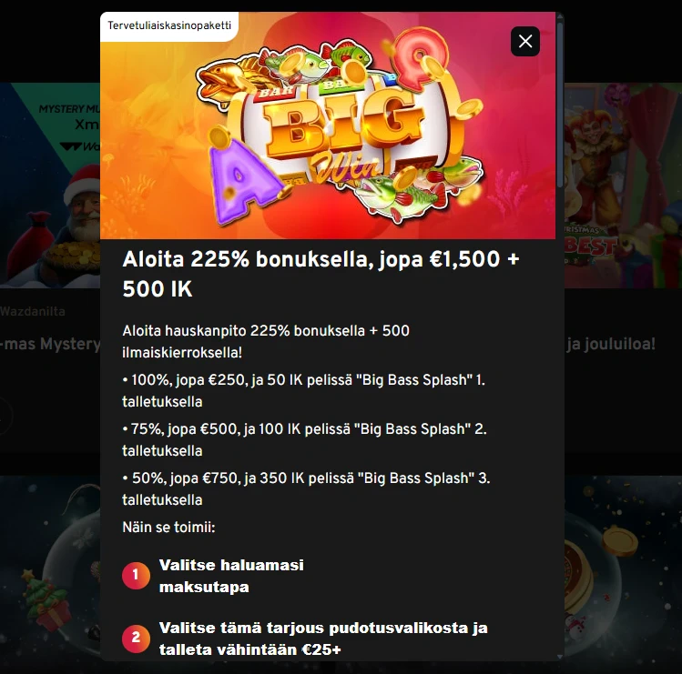 Suomalaiset pelaajat avaavat valtavia palkintoja LuckyTrunk Casinolla, jolla on Malta Gaming Authorityn lisenssi (MGA/B2C/233/2013) turvalliseen ja reiluun pelaamiseen. Sukella kolmivaiheiseen tervetulomatkaan, jossa on 225 % ensitalletusbonus aina 1 500 euroon asti sekä 500 ilmaiskierrosta Big Bass Splash -peliin. Selkeät säännöt kertovat minimitalletuksen (25 €), etukäteispanostusvaatimuksen (kuten 35x) ja helpon aktivoinnin Deposit & Play -valikosta—palvelu on saatavilla englanniksi, saksaksi, espanjaksi, norjaksi ja suomeksi.